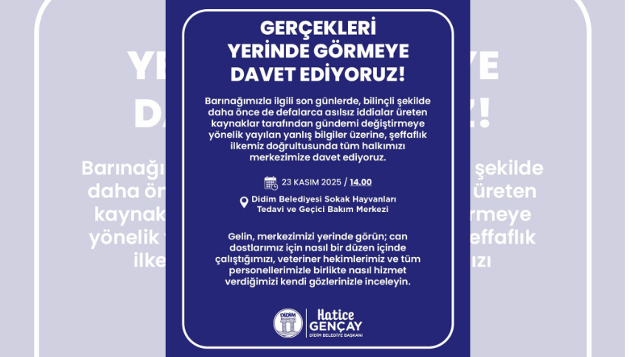 Didim Belediyesi, Sokak Hayvanları Tedavi ve Geçici Bakım Merkezi hakkında son günlerde dolaşıma sokulan iddialar üzerine, kamuoyunun doğru bilgiye doğrudan ulaşabilmesi amacıyla merkezde yerinde inceleme ve bilgilendirme programı düzenliyor. Program kapsamında, 23 Kasım Pazar günü saat 14.00’te tüm vatandaşlar merkeze davet ediliyor.