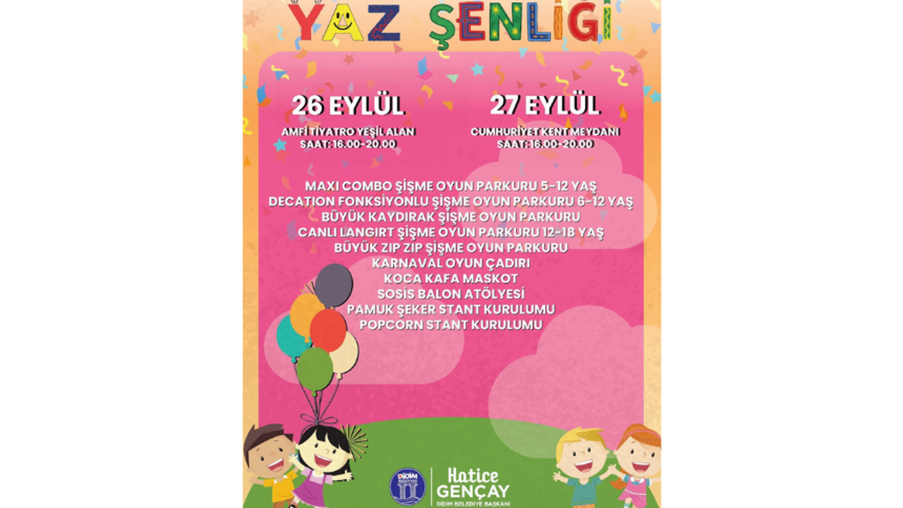 Didim'de Belediyesi tarafından Cumhuriyet Kent Meydanı’nda 26 Eylül ve 27 Eylül’de çocuklara yaz şenliği düzenlenecek. Etkinlik kapsamında çocuklar 26 Eylül’de Amfi Tiyatro Yeşil Alan’da, 27 Eylül’de Cumhuriyet Kent Meydanı’nda dev oyun parkı ve bir çok etkinliklerle buluşacak.